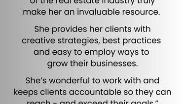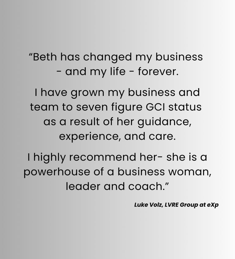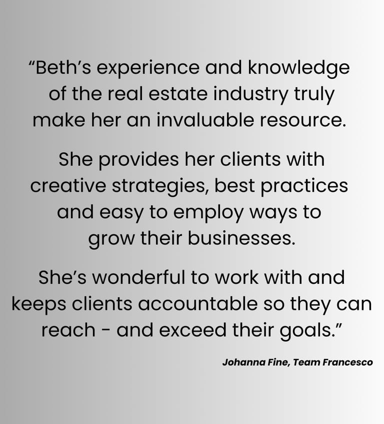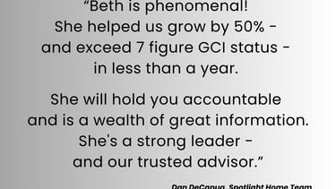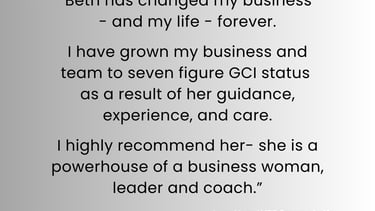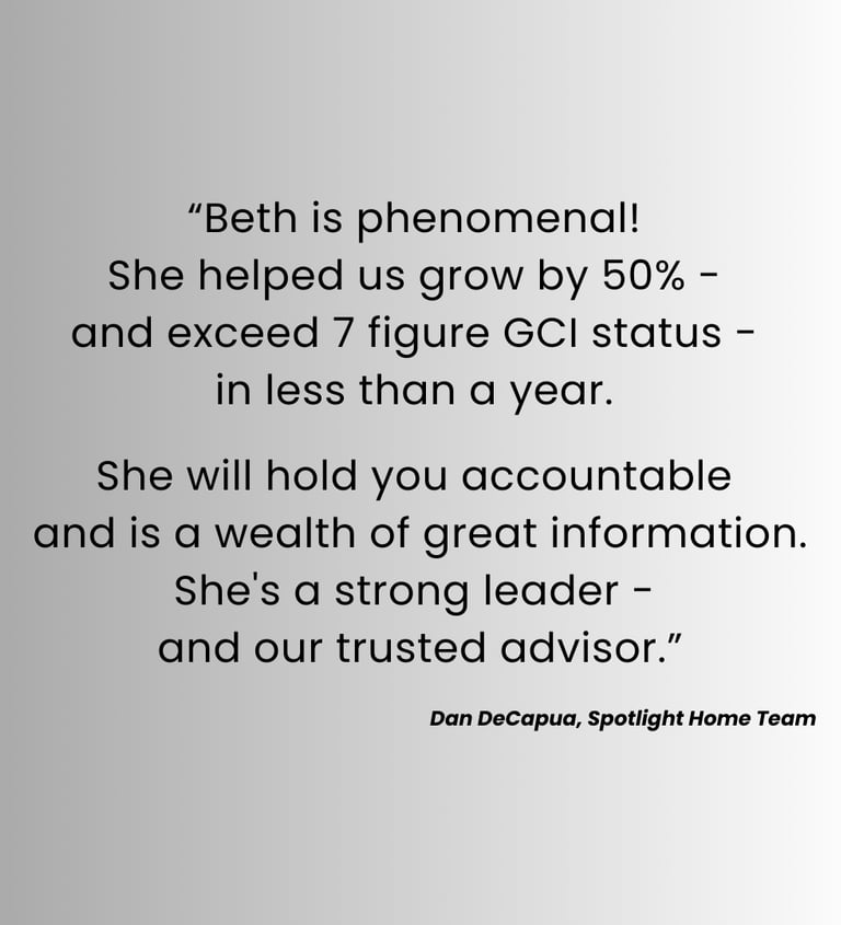 I'm Beth Incorvati, and for the last 20+ years I've helped agents, team leaders, broker-owners, mortgage specialists and title professionals increase their production, scale their businesses, create balance in their lives and realize their full potential. Those I work with say I'm more than a coach or mentor - I'm a team member deeply committed to the clients I serve.